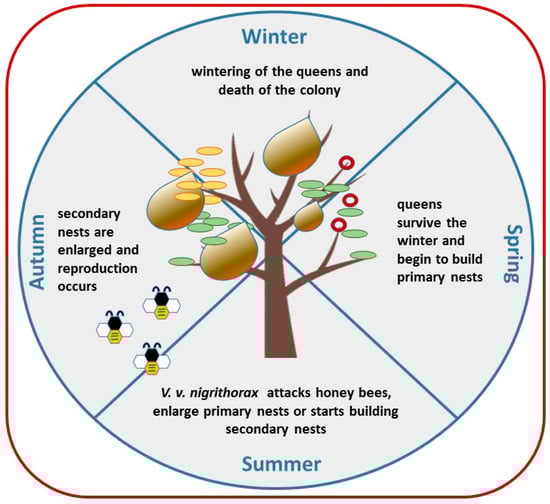 The colony of V. v. nigrithorax is started by a single inseminated queen that builds, using fibrous substances of plants origin and saliva, a primary nest after overwintering, typically in April, thus producing the first workers. During the warm season, they enlarge the primary nest (which has an approximate size between 4 cm and 15 cm) directly or build a secondary nest normally on treetops []. Nests have normally a circular shape and can grow up to 100 cm in diameter, containing several thousands of hornets. Rome et al. [] report up to 13,300 adults and 563 new queens from a single nest. At the end of the summer, reproductive individuals emerge and mate; the colonies generally collapse in late autumn or winter, while newly-mated queens search for a place where they can overwinter and, the following year, they start a new cycle [,,,], Figure 2.