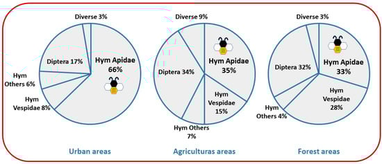 The predatory activity of V. v. nigrithorax has a negative impact on insect communities, reducing their abundance and may cause damage to local biodiversity even at the ecosystem level. The predation pressure known in apiaries since the month of July may have similar effects also on other pollinating insects, creating a decline in pollination effectiveness. In fact, besides honey bees, V. v. nigrithorax preys on other Hymenoptera, including different species of wild bees and other Vespidae (wasps in general), but also Diptera (flies and mosquitoes), butterflies species and other insects. Species preyed upon by V. v. nigrithorax and their proportion varies according to the prey availability in the environment. A French study showed that in an urban environment, V. v. nigrithorax preys mostly honey bees and other Apoidea (66% of the diet), while in a woodland environment, bees and other Apoidea drop to 33% and Diptera increase to 32% [] (Figure 4).