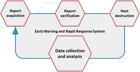 An early detection of V. v. nigrithorax in areas far away from the expansion front allows to perform a rapid response aimed to remove these isolated populations before the settlement of the species []. In fact, V. v. nigrithorax queens might be accidentally transported by human activities in very remote areas, where these insects can give rise to new colonies and populations []. An early warning and rapid response system (EWRRS) for V. v. nigrithorax is based on three key moments (Figure 5).