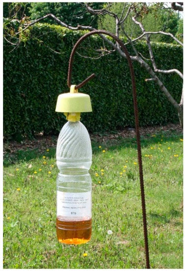 In addition to proprietary baits, many types of self-produced carbohydrate or protein baits can be used. Sugar based baits include beer, vinegar, grenadine, acetic acid, fermented honeycomb juice, honey, different type of sweeteners mixtures, etc. []. They are better used between February and May, so to catch the founder queens when they begin the construction of the primary nests, and from August until November, to detect the presence of the species in new areas or to catch the reproductive adults. Demichelis et al. [] recommend the use of lager beer (0.33 litres with 4.7% alcohol), because it is attractive for the hornets, inexpensive, and selective towards honey bees (Figure 6).