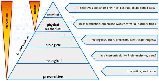 Control invasive alien species is difficult and expensive in the long term; therefore, every effort should be undertaken to prevent their establishment and diffusion in new areas. The many methods developed to control V. v. nigrithorax in Europe and in Asia outside of its native range have been previously reviewed [,,,,].