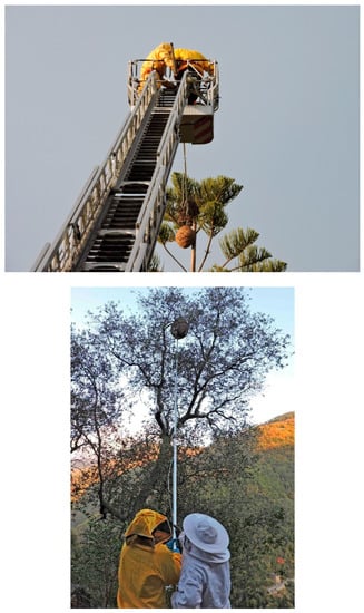 Nests are generally treated with insecticides for hornets and wasps, using also special extendable rods capable of reaching nests that are in high positions (Figure 8).
