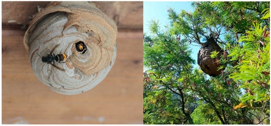 - Feàs Sanchez, X.; Charles, R.J. Notes on the Nest Architecture and Colony Composition in Winter of the Yellow-Legged Asian Hornet, Vespa velutina Lepeletier 1836 (Hym.: Vespidae), in Its Introduced Habitat in Galicia (NW Spain). Insects 2019, 10, 237. [Google Scholar] [CrossRef]
