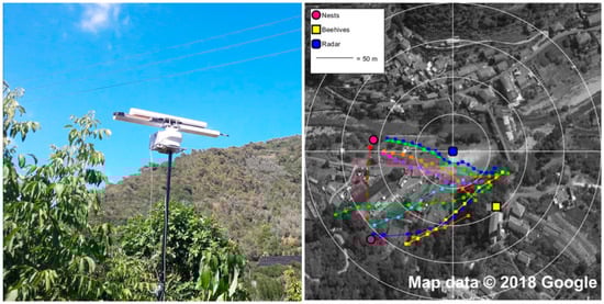 A European LIFE project (LIFE STOPVESPA) has just been completed to contain the spread of V. v. nigrithorax in Italy by implementing an EWRRS (https://www.vespavelutina.eu/en-us/). For this reason, two prototypes of harmonic entomological radars able to track the flight of hornets in real time and quickly locate the position of nests were developed by the Polytechnic University of Turin (Italy). The radars are capable to follow the flight of hornets equipped with a passive transponder (tag). The radar emits a series of short pulses at a given frequency (9.41 GHz), which are then retransmitted at a double frequency (for this reason, it is called ‘harmonic’) by the tag fixed on the thorax of the hornets (Figure 10) [,]. The tracks obtained allow to follow the path of the hornets and locate the nests. Thanks to the high transmission power, a wide maximum operating distance of 490 m was obtained [].