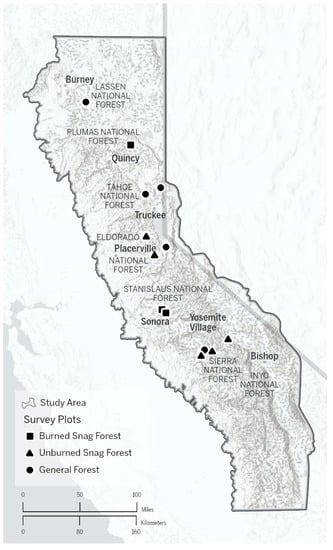 In the Sierra Nevada mountains of California, USA, the black-backed woodpecker (Picoides arcticus) is an uncommon species associated with dense middle/upper-montane conifer forests recently burned in mixed-severity wildland fires [,]. A high snag basal area has been found to be an important metric to predict black-backed woodpecker occupancy in burned forests [,,]. However, black-backed woodpeckers have also been detected in unburned forests with elevated levels of snags, including in the Sierra Nevada [], eastern Oregon [], and the Black Hills of South Dakota []. This species is also known to nest and breed in late-successional and old unburned boreal forests in eastern Canada, especially in forest stands with large volumes of deadwood [,]. Similar research in unburned forests of the Sierra Nevada is generally lacking, however. Thus, there is uncertainty about the type and spatial extent of the existing habitat for this species, and corresponding uncertainty about the current population level of black-backed woodpeckers in the Sierra Nevada. This uncertainty is compounded by ongoing forest management practices that encourage the logging of snags in unburned forests and target dense, older forests for logging activities and the removal of mature, live trees [].