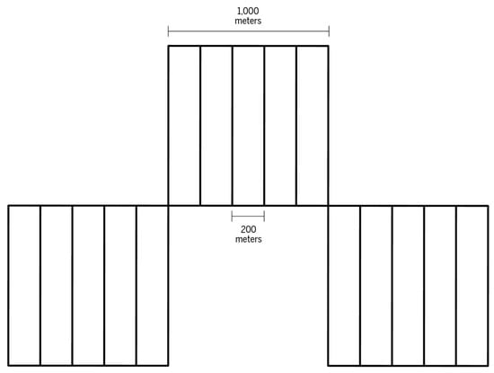 For general forests, we restricted the sampling landscape to areas >2 km from any fire area 1998–present, and also excluded any areas that experienced high-severity fire [] from 1984 to present (satellite imagery to detect and record high-severity fire occurrence became available in 1984), since such areas would not yet have regenerated into mature conifer forests following high-severity fire. Within the resulting general forest areas, 300 ha plots were systematically arranged, with the southwest corner of each plot located at the intersection of each increment of 5 min of longitude and latitude. Each plot was comprised of three square 100 ha subplots, with the middle subplot offset 1 km to the north relative to the others, and each subplot consisted of five contiguous strips 200 m wide and 1000 m long, oriented lengthwise south to north (Figure 2).
