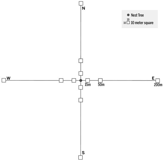 When black-backed woodpecker nests were found within plots, we determined the snag basal area in the nest core by measuring the diameter of all snags over 10 cm in diameter in 12 0.01-hectare square plots in the four cardinal directions from the nest tree, with four such plots at 15 m from the nest, four plots at 50 m, and four at 200 m (Figure 3).