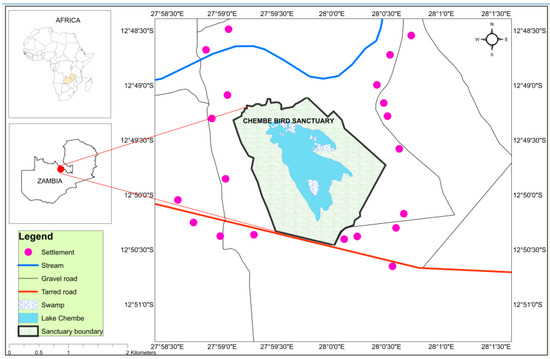 This study was conducted in CBS (27.9955° E, 12.8302° S; 539 ha) and its adjacent area, located in Kalulushi District, Zambia (Figure 1). The study site lies in the Zambezian bioregion [30,38]. The area’s mean rainfall is 1200 mm per annum, and temperatures range between 18 and 30 °C [39]. Inside the CBS, there is Lake Chembe and outside the CBS are many wetlands, in the form of streams and ponds. The CBS is fenced and kept natural, precluding several anthropogenic activities, such as land clearing.