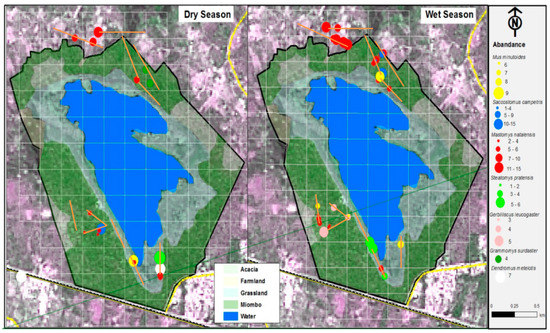 This study reveals dynamic patterns of rodent assemblages across seasons and habitats in the CBS landscape (Figure 3 and Figure 5; Table 1). Although specific behavioural (activity) data per species is outside the scope of this study, it can be speculated based on patterns of rodent assemblages in CBS landscape in this study that seasonality in the rodent assemblages might have been affected by a number of factors, inter alia: (1) vegetation cover for protection from predators and food availability, which are usually more abundant in wet seasons than in dry seasons [14,53]; (2) as a result of food availability and vegetation cover, rodents prefer breeding and raising offspring in the wet seasons to the dry seasons [54,55,56]; (3) rodents may experience torpor during the dry seasons to conserve energy [57,58]; (4) rodents would also cache food for use when in short supply in the dry seasons or food deficient years, which could further limit demand for foraging [59,60]; and (5) some species, such as D. melanotis would prefer dry grasses to fresh ones [9].