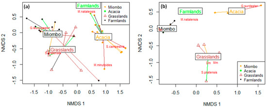 Figure 3. Species–habitat associations of rodent community in the Chembe Bird Sanctuary landscape, Zambia, in 2018–2019 in wet (a) and dry (b) seasons, respectively, derived from Non-metric Multi-Dimensional Scaling. The terminal points in Figure 3a,b reveal networks of different rodent samples in particular habitats. Line colours show the similarity of species presence in a particular habitat in relation to other habitats. In Figure 3b, Sc in Miombo woodland represents S. campestris, while Dm and Mm in grasslands represent D. melanotis and M. minutoides, respectively.