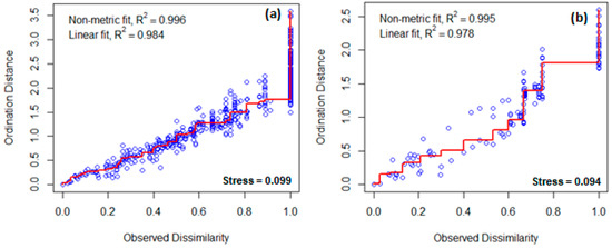 Figure 4. Stress plots (Shepard’s diagrams) showing the fit of configuration in two dimensions (k = 2) with original data patterns of counts in the rodent communities in the Chembe Bird Sanctuary landscape, Zambia, in 2018–2019 in wet (a) and dry (b) seasons, respectively. The hollow circles (points) and red lines (i.e., monotonic step lines) represent rodent counts and the model fits, respectively.
