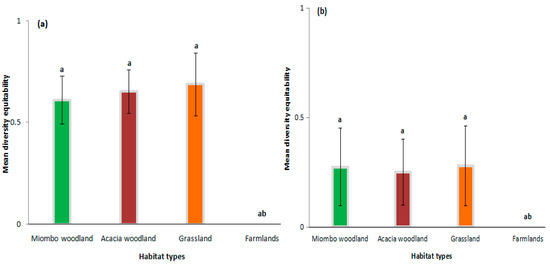 Figure 5. Mean diversity of rodents across different habitat types in Chembe Bird Sanctuary landscape, Zambia, in 2018–2019 in wet (a) and dry (b) seasons, respectively. The error bars represent the standard errors in the mean diversity of rodents. Letters a, b, and ab above the bar graphs denote significant differences of mean diversity of rodents among different habitat types.