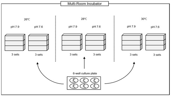 Healthy adult females and males of A. ohtsukai were collected under a dissecting microscope (Nikon SMZ645, Nikon, Tokyo, Japan) and then acclimated in 2-L glass beakers filled with filtered seawater using GF/C filter for 24 h. To determine the EPR, pairs of healthy adult A. ohtsukai (a male and a female in each pair) were placed on six-well cell culture plates already adjusted to the pH treatment requirements. A total of 18 pairs of Acartia were used to measure egg production per treatment. After placing copepods, the evaporation and exchange of CO2 were minimized with parafilm. The plates were then incubated in a Multi-Room incubator (WIM-RL4, DAIHAN Scientific Co., Wonju, Korea) according to the required temperature for each treatment. Three duplicates were undertaken for each treatment (Figure 2). During the experiment, the pH of the seawater was measured daily using a pH meter. The food provided to copepods was collected using a conical plankton net (diameter, 45 cm; mesh size, 20 µm) as natural food (2 × 103 cells mL−1). The food was supplied once at the beginning of the experiment using a pipette. The EPR was measured after 24 h using a dissecting microscope (Nikon SMZ645). The eggs produced were transferred to the new six-well cell culture plates under the same pH, temperature, and food concentration conditions to minimize egg cannibalism by adult copepods during experiment. The EHS was measured counting nauplii every day for 5 days.