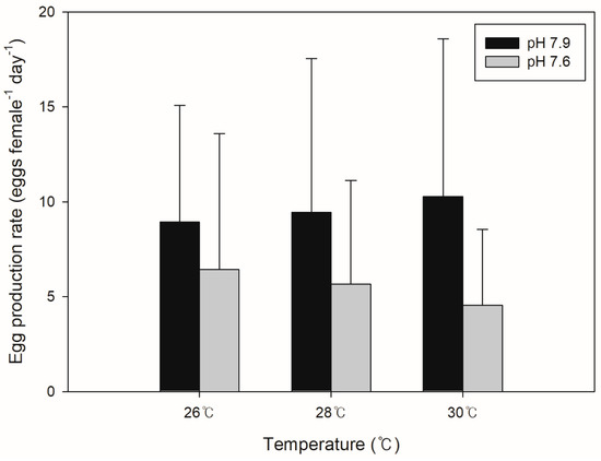 The mean EPR of the pH 7.9 and pH 7.6 groups was 9.60 and 5.60 eggs f−1 d−1, respectively. In more detail, at 26 °C, the mean EPR was 8.94 ± 6.13 eggs f−1 d−1 for pH 7.9 and 6.44 ± 7.15 eggs f−1 d−1 for pH 7.6. At 28 °C, the mean EPR was 9.44 ± 8.10 eggs f−1 d−1 for pH 7.9 and 5.67 ± 5.46 eggs f−1 d−1 for pH 7.6. At 30 °C, the mean EPR was 10.28 ± 8.29 eggs f−1 d−1 for pH 7.9 and 4.56 ± 3.99 eggs f−1 d−1 for pH 7.6 (Figure 3, Table 2). EPR significantly differed between pH 7.9 and 7.6 (F = 9.646, p = 0.0025). However, EPR did not differ among each temperature (F = 0.016, p = 0.9846). There was no significant difference for the interaction of pH and temperature (F = 0.5291, p = 0.5907).
