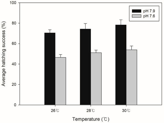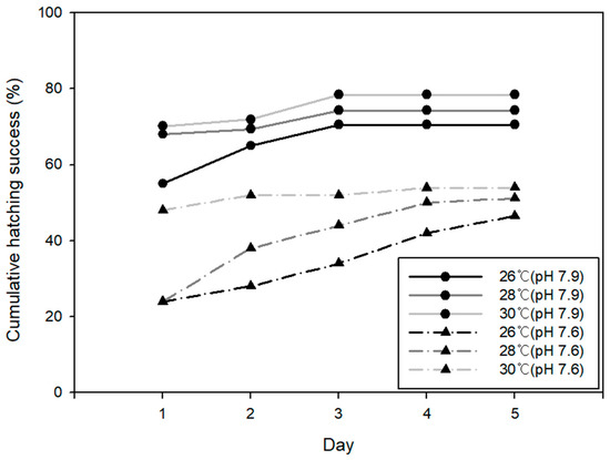The overall mean EHS was 74.4% for pH 7.9, whereas the pH 7.6 mean was 50.50%. When the temperature was maintained at 26 °C, the mean EHS was 70.50 ± 2.97% for pH 7.9 and 46.50 ± 2.89% for pH 7.6 (Figure 4). When the eggs were maintained at 28 °C, the mean EHS was 74.30 ± 5.35% for pH 7.9 and 51.20 ± 2.47% for pH 7.6. The mean EHS at 30 °C was 78.40 ± 4.95% for pH 7.9 and 54 ± 3.74% for the pH 7.6. EHS significantly differed between the pH 7.9 and 7.6 (F = 122, p < 0.0001). Also, EHS differed among the each temperature (F = 4.203, p = 0.0318). However, EHS did not differ for interaction of pH and temperature (F = 0.332, p = 0.9674). EHS by day was as follows (Figure 5): At pH 7.9, EHS increased until 3 days after the start of the hatching rate observation, and there was no variability after 3 days. At pH 7.6, EHS was more variable over time. There were statistically significant differences in EHS among different days (F = 3.529, p = 0.0246).