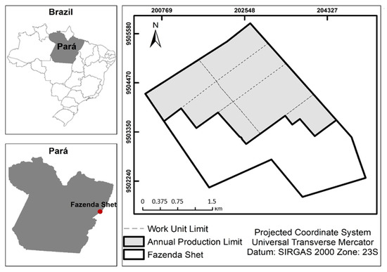 Shet Farm, managed by Grupo Arboris, is located in the municipality of Dom Eliseu, state of Pará, Brazil (altitude 320 m, 4°30′48″ S and 47°39′36″ W). The forest management is carried out in the Legal Reserve area (535.6 ha), subdivided into seven working units (UT) (Figure 1). This study is part of the SubBosque Project, registered by the Innovation Network of the logging forest production chain to promote the sustainable development of the State of Pará-SubBosque Forest Biomass Network (Embrapa Project SEG Code 02.10.00.001.00.02).