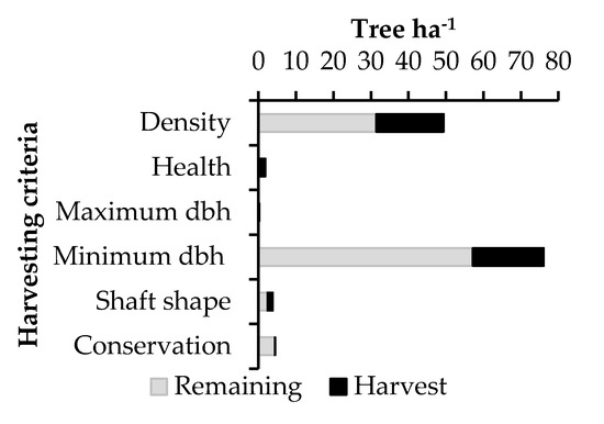 In this study, harvesting trees with compromised health is potential alternative to eliminate hosts of pests and diseases and to make available a greater amount of resources (e.g., space, light, water, and nutrients). Is is known that pests and diseases can lead to changes in the composition, structure, functions, and productivity of forests [64,65,66]. This criterion represented a relatively low percentage in relation to the total population inventoried (2.16%; 1.854 trees ha−1). However, 98.79% of these trees with compromised health were destined for harvest and used in the industry.