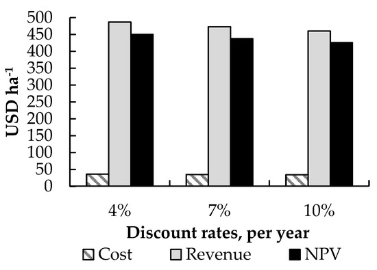 Scenarios with interest rates below and above the rate of 7% per year showed positive NPV in all simulations. It shows that with a fluctuation in the discount rate between 4% and 10% there is no probability of obtaining an NPV below USD 425.62 ha−1. This fact weighs in favor of forest owners who have invested in these forest profiles in recent decades but still could not economically enjoy the wood products of the respective forests.