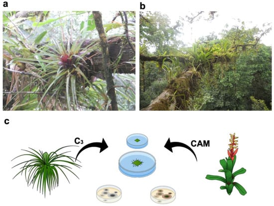 Tropical bromeliads frequently form associations with an abundant and diverse group of microsymbionts. These can include, algae [6], freshwater protozoa [7], yeasts [8], phyllosphere bacteria [9], and arbuscular mycorrhizal fungi [10,11]. However, because of their cryptic nature, foliar fungal endophytes—microfungi living within asymptomatic plant tissues—have seldom been studied in bromeliads. Research on fungal endophytes in bromeliads has primarily focused on fungi living within root tissues (i.e., dark septate endophytes) and their associations with plant functional traits [12,13], yet fungal endophytes within bromeliad leaf tissues have remain underexplored [14,15]. One study compared endophytic fungal communities between tropical trees (Hevea spp.) and epiphytic bromeliads (Tillandsia spp.) and found distinct communities [14]. The reasons for the different endophyte communities remain unknown but could be due to the fact that the sampled plants were from distinct geographic regions and had different photosynthetic pathways (Hevea spp. use the C3 photosynthetic pathway and Tillandsia spp. use the water-conserving, crassulacean acid metabolism (CAM) photosynthetic pathway). Plants that vary in their photosynthetic pathway also exhibit distinct differences in leaf ecophysiological traits; CAM species often have larger cells to store malate and thicker leaves to reduce the CO2 leakage relative to their C3 counterparts [16]. Foliar fungal endophytes (hereafter, endophytes) are known to be highly abundant and hyperdiverse in ferns, grasses, and woody angiosperms and gymnosperms in the tropics [17,18,19,20]. Still, our understanding of how plant functional traits are associated with structuring endophyte abundance, diversity, and community composition in tropical plants remains limited to understory woody trees. For example, endophyte communities of trees in a lowland rainforest of Papua New Guinea were correlated with variation in foliar traits, including leaf mass per area (LMA) and leaf carbon and nitrogen, and multivariate analyses showed that community composition of endophytic fungi in 10 dominant trees species in a temperate rainforest in Southern Chile were associated with variation in leaf resistance traits, such as leaf toughness and leaf anthocyanins [21]. Epiphytic bromeliads in the rainforest canopy with distinct ecophysiological leaf traits, offer an intriguing plant–fungal system by which to investigate the relationship between host functional traits and foliar endophyte communities.