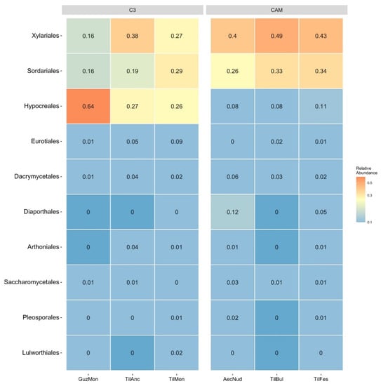 A heat map of the relative abundance of fungal orders across the entire data set revealed that Xylariales, Sordariales, and Hypocreales were the three most abundant orders across the six bromeliads species (Figure 3). Xylariales were the most abundant fungi in CAM bromeliads (range: 40–49%) followed by Sordariales (26–34%). Xylariales and Sordariales showed a more heterogeneous distribution within the C3 bromeliads; Xylariales were most abundant in Tillandsia anceps (38%), and Sordariales were most abundant in T. monodelpha (29%). Hypocreales fungi were generally found within C3 bromeliads (27–64%), and were highly abundant in Guzmania monostachia (64%); in contrast, Hypocreales were found at low abundances (8–11%) in CAM bromeliads. The relative abundance of Hypocreales varied less within CAM bromeliads compared to C3 bromeliads (Figure S2), though no significant test was performed. On average, the relative abundances of Xylariales and Sordariales were higher in CAM, relative to C3 bromeliads, while Hypocreales were higher in C3 bromeliads.