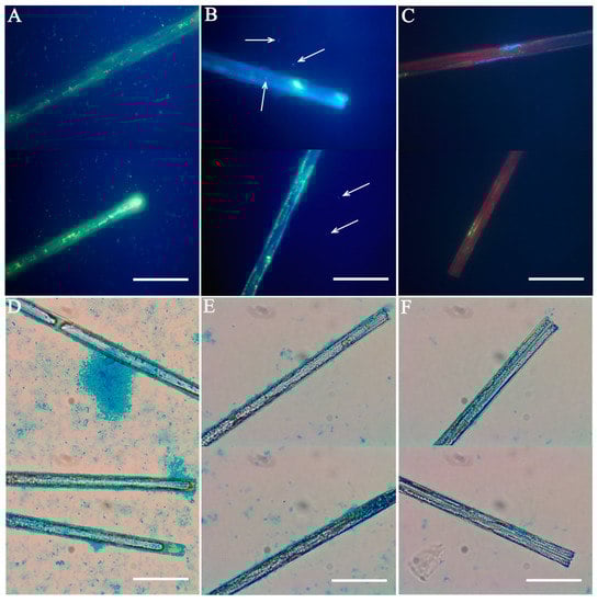 Microscopic validation of diatom Ulnaria danica. (A–C) DNA staining: (A) xenic culture; (B) culture after filtering and washing; (C) axenic culture. (D–F) extracellular polymeric substance (EPS) staining: (D) exponential phase of growth; (E) latent phase of growth; (F) after washing. Bacteria are marked by arrows. Scale bars: 10 µm.