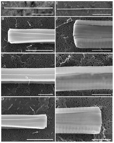SEM validation of diatom U. danica. (A–D) Xenic culture after filtering and washing; bacteria are marked by arrows. (E–H) Axenic culture. Scale bars: A, E—100 µm; B, D—10 µm; C, F, G, H—5 µm.