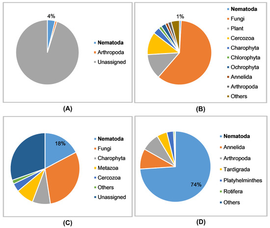 Relative distribution of sequence reads in soil samples amplified with JB: JB3/JB5 (A), SSU: SSU_04F/SSU_22R (B), MMS: MMSF/MMSR (C), and NEM: Nemf/18Sr2b (D) primer sets; percentage indicates the proportion of sequence reads that were assigned to Nematoda.