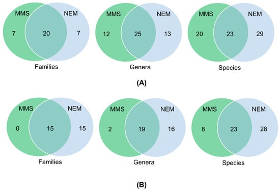 Venn diagrams showing the number of nematode taxa detected in soil (A) and root samples (B) by the MMS (MMSF/MMSR) and NEM (Nemf/18Sr2b) primer sets.