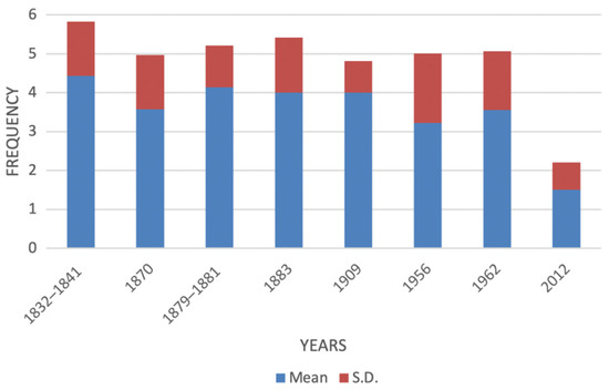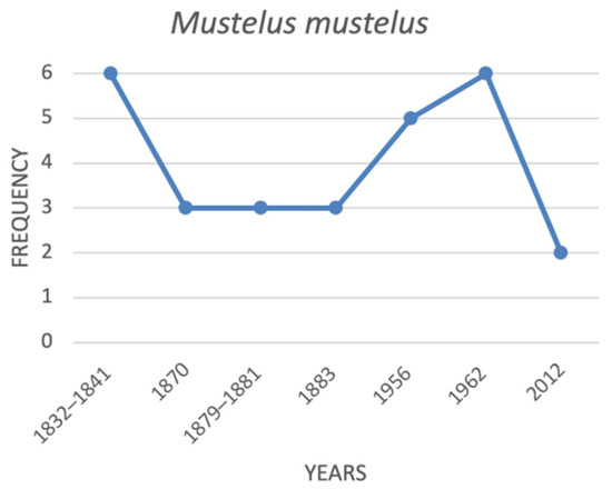 Our results highlight that the common smooth-hound, Mustelus mustelus, is very sensitive to fishing pressure in Italian waters. It nevertheless shows remarkable resilience, as also reported in other maritime sectors [86].There is a perception of a decrease in the frequency of observations of this species in the local historical scientific literature that corresponds to regular and continuous fishing pressure during the 19th century and the last 70 years. This observation is in line with a recent study on a century of fishery data on sharks of the genus Mustelus in the Mediterranean Sea, demonstrating the collapse of these marine vertebrates that occurred primarily in the last decades [28]. On the contrary, the recorded numbers of M. mustelus increased when the fishing effort partially or completely stopped during WWII and in the first years after the war. Similar trends were reported by D’Ancona for the Adriatic Sea [87,88] and have been recently confirmed for the entire Mediterranean basin by Colloca et al. [28] The dramatic collapse of M. mustelus and congeneric species in the Mediterranean basin and along the Italian coasts can be attributed mainly to the impact of direct fishing pressure [28], although it is also possible to relate it to the overfishing of its most common preys, which has also happened recently in the Mediterranean basin [89].