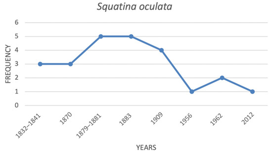Squatina oculata was considered uncommon until the end of the 19th century when it was more commonly recorded (Figure 4). In the first decades after WWII it became rare again. Today, S. oculata is evaluated as very rare in the Italian seas and is listed as critically endangered (CR).