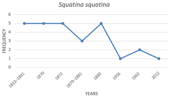Squatina squatina was considered frequent along the Italian coast during the entire 19th century (Figure 5). Its populations seem to have collapsed during the first decades of the 20th century, and it became very rare from the 1940s onwards. S. squatina is currently listed as critically endangered (CR).