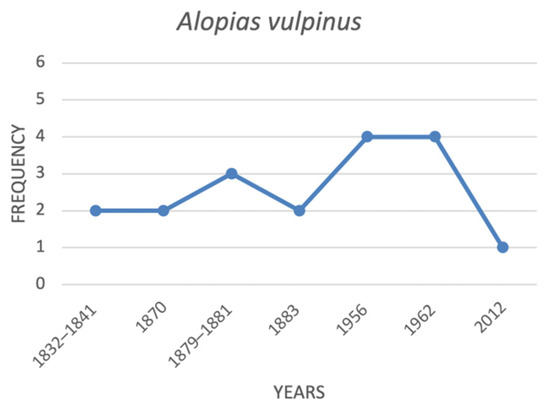Alopias vulpinus, the thresher shark, is a typical pelagic shark, living in an offshore marine environment, and is rarely observed near the coastline [73]. In the Mediterranean, this species may be captured as by-catch in pelagic fisheries, mainly by longliners [74,75], but also during pair trawling fishing operations [64], as well as in offshore recreational fisheries [76]. In Italian waters, the uncommon detection of thresher sharks from the 19th century to the end of WWII can be related to the scarce chance of observing this high seas species in typical coastal fishing operations. Offshore pelagic fisheries require powerful engines to reach offshore fishing grounds, which were develop only during the past century [77]. In Italy, in particular, until the early 20th century, fishing was mainly practiced close to the coastline from boats powered by sails or oars, whereas motor fishing vessels were extremely rare [78,79]. On the contrary, after the forced stoppage due to WWII, the Italian fishing fleet underwent a technological change, mainly due to the development of powerful diesel engines, which caused a rapid increase and expansion of fishing efforts, which included pelagic fisheries [80]. The exploitation by the Italian fishery fleet of novel and pristine fishing grounds, like offshore pelagic environments, during the 1950s could be linked to the enhanced frequency of capture of A. vulpinus reported in the analyzed scientific literature. In the same way, the rapid decline in records of this species in the last 70 years may be connected to overexploitation of pelagic marine resources, including medium and small fishes, like mackerels, anchovies and sardines, which happen to be common preys of A. vulpinus [81,82,83], but which are also one of the most important pelagic fishery resources in the Mediterranean Sea, where their capture numbers have decreased since the 1970s [49,83,84]. This may influence the upper trophic level, as was recently hypothesised for the thresher shark [85].