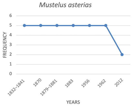 Mustelus asterias was considered very common in the Italian waters from the beginning of the 19th century until the 1950s (Figure 7). In the past 70 years, M. asterias has become rare and is now listed as endangered (EN).