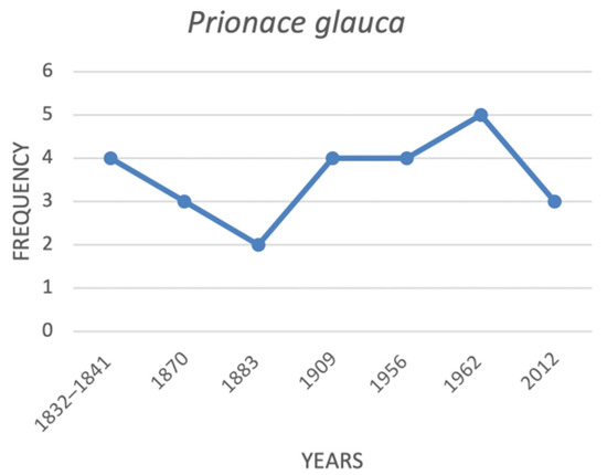 Prionace glauca was considered uncommon during the 19th century, although records indicated that it became more frequent from the beginning of the 20th century until the end of WWII (Figure 9). In the last 70 years this species has been considered rare and has been listed as vulnerable (VU).