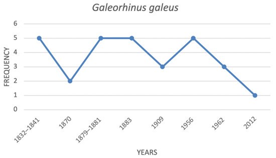 Galeorhinus galeus was considered common in Italian waters at the beginning of the 19th century. In 1870, records described it as rare. Thereafter, it was considered common again until the beginning of the 20th century. After WWII, G. galeus was again considered very common, but it has since been cited as less and less common and is currently classified as critically endangered (CR) in Italian waters (Figure 10).