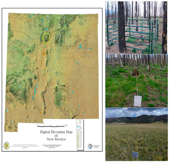 Map of New Mexico. Yellow oval outlines the Valles Caldera National Preserve. The three habitats affected by the Las Conchas fire: Ponderosa pine forest, top; Mixed-conifer forest, middle; Mountain Valley Grassland, bottom. The ponderosa pine image shows the pitfall and fencing arrangement.