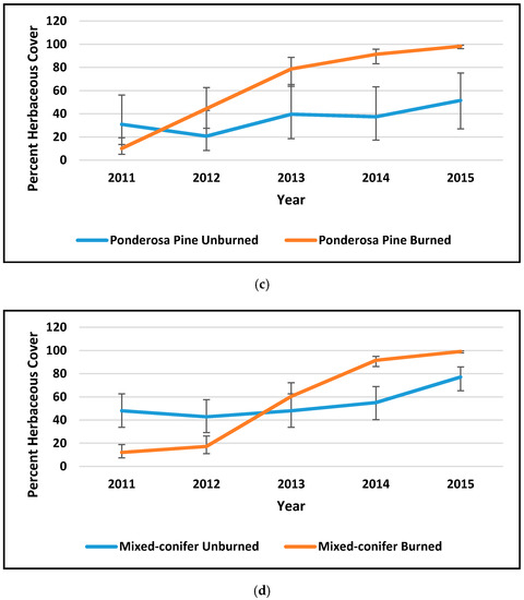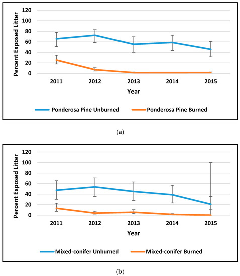 July maximum air temperatures ranged from 30 to 33 °C and January minimum air temperatures from −23 to −32 °C. Soil temperatures were buffered somewhat for summer temperatures (23–29 °C) and more strongly for winter minimums (−4 to −6 °C). Rainfall occurred mostly during the summer (“monsoon”) months [23]. Vegetation cover and exposed litter were regularly monitored by Caldera staff (Figure 2). In New Mexico, most rainfall occurs primarily during July–September (summer or monsoon pattern). At the Caldera from 2011–2015, rainfall ranged from 111 to 160 mm per month in the summer, while amounts ranged from 0 to 50 mm per month at other times of the year. Drought conditions were described by the Palmer Drought Severity Index, which measures departures from normal years in temperature and precipitation. Positive values are wetter years, negative values are dry or drought years. The year 2011 was in moderate to extreme drought (index values of −2.00 to −4.00), 2012 was in severe to extreme drought (−3.00 to −4.00), 2013 was in the mid-range (neither drought nor wet) to severe drought (−1.99 to −3.00), 2014 was in the mid-range to moderate drought (−1.99 to −2.00), and 2015 was in mid-range to very moist conditions (−1.99 to +3.99) [24].