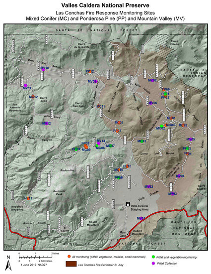 This study took place in the Jemez Mountains at the Valles Caldera National Preserve, which is within the National Forest and which experienced stand-replacing burns in the ponderosa pine forest, moderate to severe burns in the mixed-conifer forest, and less severe burns in mountain grassland in 2011. At the Caldera, monitoring of abiotic factors and biotic responses began as soon as the fire was contained, through the Collaborative Forest Landscape Restoration Project (CFLRP) for the southwest Jemez Mountains. The CFLRP had been established in 2010 to restore forest resilience to wildfire and other disturbances and improve conditions for wildlife, watersheds, and vegetation [5]. Ground-dwelling spiders, harvestmen, and selected mite groups were among the animal taxa chosen to be monitored from 2011 to 2015. They had not previously been surveyed at the Caldera, so this monitoring effort also provided the opportunity to add to the known diversity and distribution of these groups in a region that is relatively understudied (but see [6,7,8]).