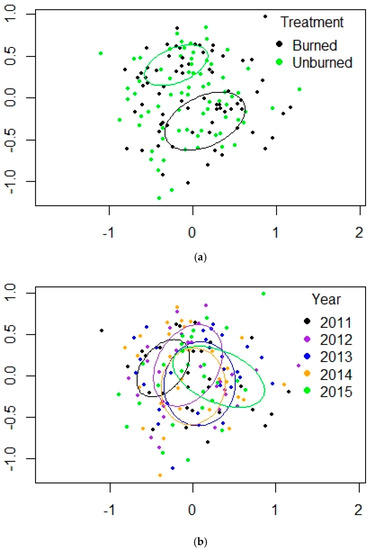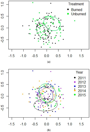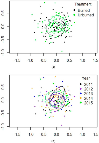 (a,b). NMDS plots for PERMANOVA results for mixed-conifer forest at Valles Caldera. (a) treatment, (b) year. Ellipses are the 95% confidence intervals for the locations of the centroids.
