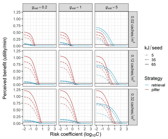 As foragers become hungrier, the benefits of pilfering remain stable, while the benefits of retrieval increase due to the forager’s shift in usage from recaching, which provides relatively little benefit under any circumstance, to eating, which provides much greater benefit when animals are hungry. Consequently, the giving-up thresholds for risk converge in the middle column, where the utility gained by eating a seed matches that gained by caching a seed (i.e., ), and become inverted in the right-most column, where the retrieval threshold exceeds the pilfering threshold. When foragers are hungry, retrieval also becomes the dominant strategy at moderate risk levels and lower cache densities, with a peak advantage over pilfering that occurs at higher risk levels for seeds with greater energy content (compare curves in the right-hand column of Figure 2, see also Figure 3).