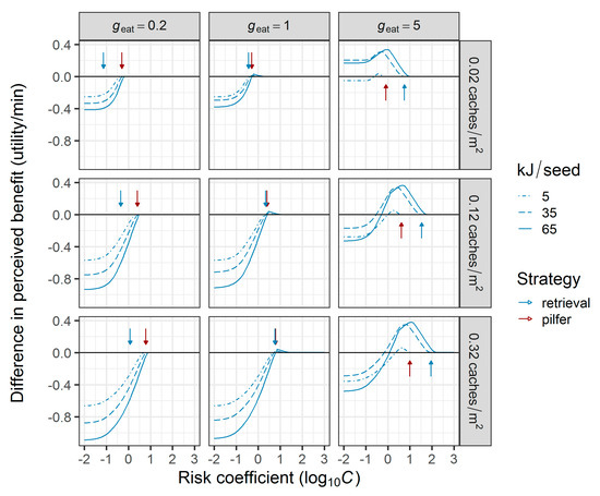 The curves in Figure 2 illustrate differences between the respective retrieval and pilfering curves seen in Figure 1. Assuming that foragers lack perfect information, we would expect them to employ a mixed strategy of pilfering and retrieval when this difference is equal to zero [14,75]. At negative values, pilfering will dominate, and at positive values, pilferage will dominate, with the degree of dominance dependent on the magnitude of the difference. Thus, increasingly positive values indicate greater relative retrieval advantages. Arrows indicate the risk levels at which the 65 kJ curves crossed the hypothetical giving-up threshold illustrated in Figure 1 by the black horizontal line in each panel.