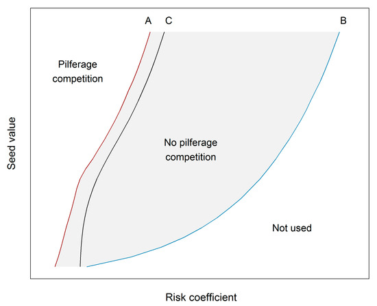 The phase-plane for perceived risk of foraging at a given location and the value of seeds cached at that location can be divided into three regions. Starting at the left, isopleth A (red line) marks the threshold at which the benefit of pilfering other animals’ caches intersects a hypothetical giving-up rate, so that pilferers should move elsewhere or switch foraging strategies. Cache retrieval remains profitable, but pilferage is not profitable, in the shaded region between isopleths A and B (blue line). To the right of isopleth B, retrieval also becomes unprofitable. Finally, isopleth C (black line) marks the combination of seed value and risk at which recovery advantages are maximized, based on a comparison of the benefit rates for retrieval and pilferage. Importantly, all three isopleths show positive relationships between seed value and risk, indicating that greater risks are needed to protect more valuable seeds. (This graph: 0.12 caches/m2 with , ; curves show similar patterns for higher or lower cache densities but isopleths shift to the right or left, respectively).