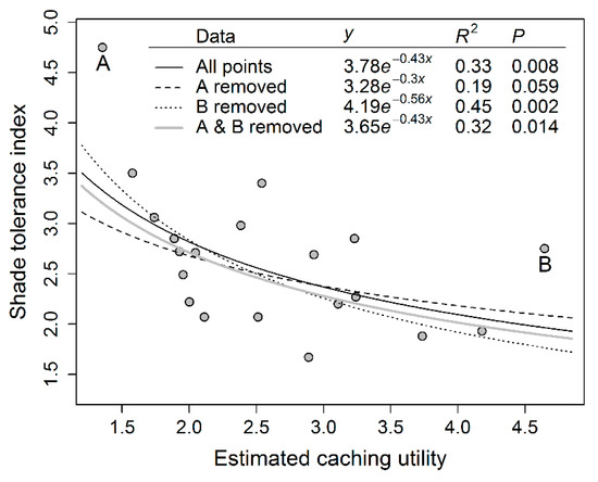 Shade tolerance is inversely related to the caching-utility of scatter-hoarded seeds. Caching data come from [72,73] and shade tolerance data from [74]. Two data points, labeled A and B on the figure, are potential high-influence points. We therefore account for statistical relationships with and without these outliers.