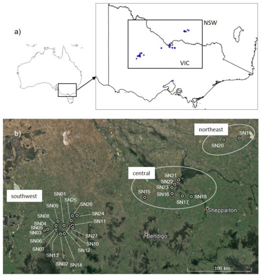 - Conn, B.J. Natural regions and vegetation of Victoria. In Flora of Victoria; Foreman, D.B., Walsh, N.G., Eds.; Inkata Press: Melbourne, Australia, 1993; Volume 1, pp. 79–158. [Google Scholar]