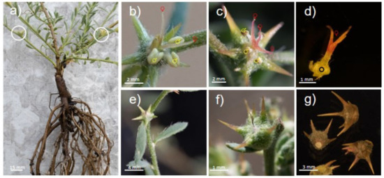 Habit, flowers, and fruit of Sclerolaena napiformis. (a) A thick rootstock develops within one year of germination and plants can re-shoot from base of stem following dieback. Developing fruit circled. The insignificant flowers, lack of petals, and exposure of stigmas and anthers to air currents are features typical of wind pollination. (b) Young flower with two stigmas (♀) and five unopened anthers (♂, two underdeveloped) visible. (c) An older flower with three stigmas (♀) and three dehisced anthers visible (♂). (d) Female reproductive organs excised from fruit showing stigma lobes (♀) and a single ovary (O). The timing of stigma receptivity is not known. (e,f) Developing fruit, with remnant of stigmas still visible (f). (g) Mature dry fruit collected from stems. Circular scar at base of one fruit shows the position of fruit attachment to the stem.