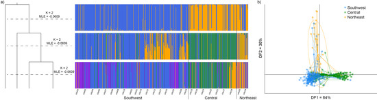 - Jombart, T.; Devillard, S.; Balloux, F. Discriminant analysis of principal components: A new method for the analysis of spatially structured populations. BMC Genet. 2010, 11, 94. [Google Scholar] [CrossRef]