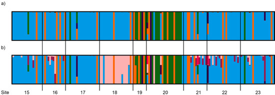 For the combined central and northeast regions, the optimal number of clusters identified from both fastStructure and DAPC was K = 4, although K = 7 was also a possibility (Figure S2). The distribution of clusters was not always well correlated with geographic location. Visualising the fastStructure output (Figure 5), at K = 4, the two northeast sites (19 and 20) were delimited from other sites but could not be distinguished from each other (Figure 5a). At K = 7, three groups were evident, with site 18 (central) and sites 19 and 20 (northeast) distinct from all other sites, which were dominated by a single genetic cluster (blue—Figure 5b). The remaining 1–4 clusters (K4 vs K7) were made up by very few individuals dispersed seemingly randomly across localities. DAPC was less successful at delimiting sites within the combined central and northeast region (Figure S3).