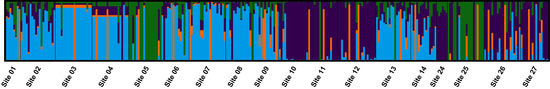 The optimal number of clusters within the southwest region as identified by fastStructure was K = 4 (Figure 6), with populations showing variable levels of admixture. There was a loose geographic association with the more westerly sites being mainly cluster 1 (blue) and more easterly sites (10, 11, 12, 24, 26, and 27) being mainly cluster 2 (purple). Sites 5 and 25 had high membership probability to cluster 3 (green) that was not explained by habitat or proximity. Cluster 4 (orange) showed no geographic association. Although not definitive, DAPC suggested six genetic clusters as the lowest likely value of K and no substantial geographic structure with most individuals assigned to a single widespread genetic cluster (Figure S4).