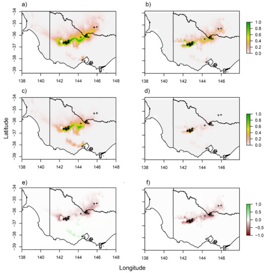 Predicted suitable habitat for Sclerolaena napiformis based on collections performed during this study. Modelling was based on (a) current climate, (b) current climate and soil composition, (c) future climate, (d) future climate and current soil composition. We also show a shift in climate suitability (e) excluding and (f) including current soil variables (increasing suitability shown by green and decreasing shown by red). Modelling was performed using 12 bioclimatic and 8 soil composition variables (Table S1). Future climate predictions are based on a conservative climate scenario (RCP 2.6) projected 50 years.