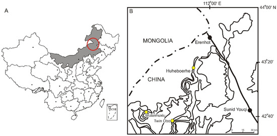 Anagalid-bearing localities in Nei Mongol (gray area), China. (A). Schematic map of China with the approximate location of the Erlian Basin marked by red circle. (B). Localities in the vicinity of Erenhot, which yielded anagalid remains (yellow dots). ((B), after Fostowicz-Frelik et al. [24], modified).